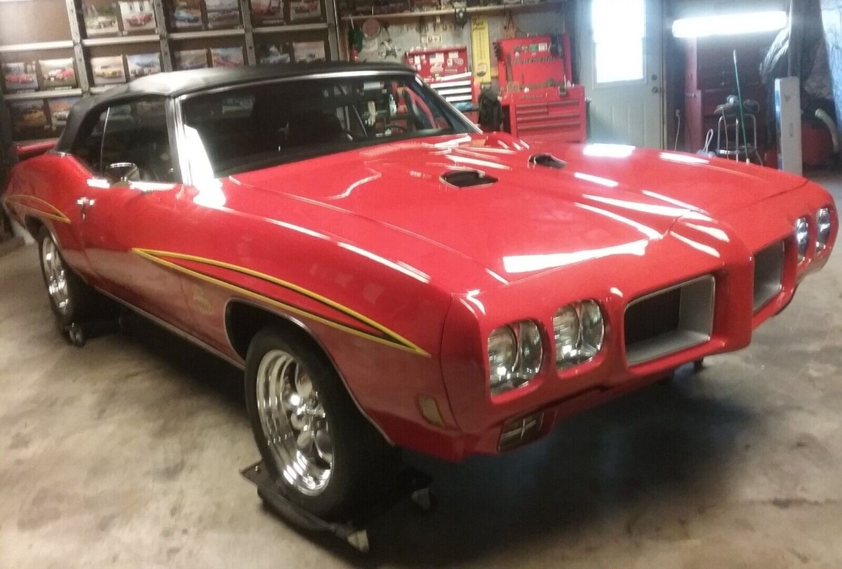 The interior looks quite good, and the paint is older and not perfect but looks very acceptable photographed in a poorly lit garage. We’re told that the sheet metal is original and there is no evidence of any rust. 17-inch aftermarket wheels with new tires have been added. Since the production numbers for the LeMans Sport convertible were never high, I may have been inclined to leave it as one rather than mimic a Judge which purists are more likely to criticize. Then, again, buying a legit Judge would cost you several times more.
