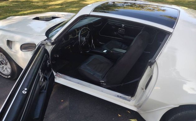 The car is painted in Code 11 Cameo white with a deluxe black interior. The front seats have cloth seat covers but the rear seats look original. The deluxe interior on the Pontiac Firebird came with upgraded seats and door panels. This car has a few options including power windows, power locks, air conditioning, T-tops and tilt steering. The dash looks like it is not cracked and the car seems to be in pretty good shape. The seller includes some up close pictures of the undercarriage which appears to have been repainted.