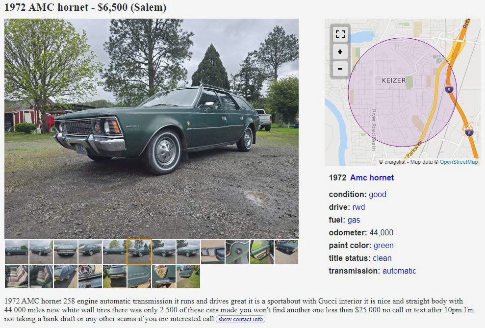 Huge props to Scotty for showing us the Craigslist ad. Because Its already gone. ( Either sold or changed their minds?) To find a Gucci edition, especially a wagon, with its interior intact is a huge plus. If the paint is original, I wonder if it would respond to a very light, very careful wet sanding, compound and polish with a wheel. I’d go that route before repainting it. I know I’ve mentioned like 58 times before we had an AMC Jeep dealer in our town and these wagons were very popular. Don’t ask me why but I remember those wheel covers on so many of them. As a kid in the 70’s, I used to look at hubcap designs, probably way more than any normal kid should. That and steering wheels as well. I can’t explain why, just something I’ve always done for as far back as I can remember. ( That and reel to reel tape decks, as very little kid, I loved watching Mission Impossible just for that, ok I’m veering waaay off course here sorry). I like this Hornet. And I enjoyed the write up Scotty, and Curvette, as always thank you for all your finds. You have a great talent finding a wide variety of vehicles that call out to everyone here.
