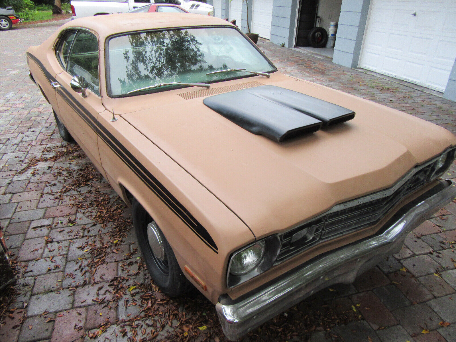 Its no real mystery , a lot can change in a 50 year old car . Its been repainted ( badly and in a horrid color) , it has replacement stripes put on it along with a Dodge style scoop. At some point another 318 was put in and painted chevy orange and the air cleaner is off a big block car.. The car was originally red, but was repainted white before the flat tan .The dash has been painted brown ,the door panels look like carboard painted black and the seats and steering column are gold, which may be original as the seller states it was a “Gold Duster” and most had the goldish color interior. The issue there is Gold Dusters would have had things like carpeting, power steering and an automatic transmission. The seller does not supply the vin, but I’d be willing to bet this was a just a plain jane slant six car , that’s been monkey’d with into this mess.