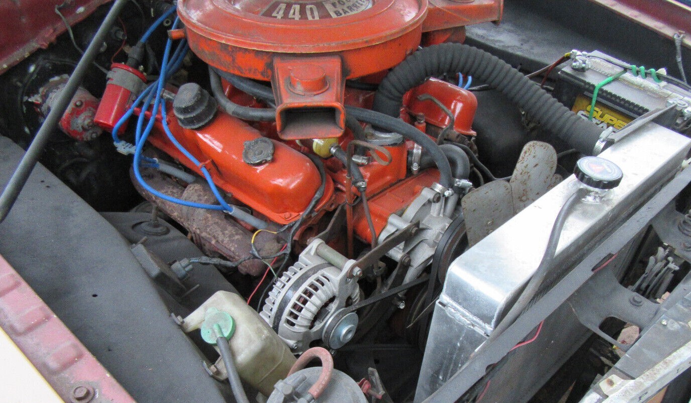 No, the poly engines and the early LA engines, along with the 225 slant sixes, were all painted the same red — a true red, not a reddish orange like Chrysler’s HP/Hemi Orange or Chevy Orange — through the 1968 model year. The engine in this car is not Chrysler Red. It has most likely been sprayed with Chevy Orange, as it doesn’t match the air cleaner, which IS painted in the orange used on street hemis and other high performance engines into the ’71 model year. Long story short, the color of whatever that mill is that’s currently under the hood, its color tells us nothing about what it really is.