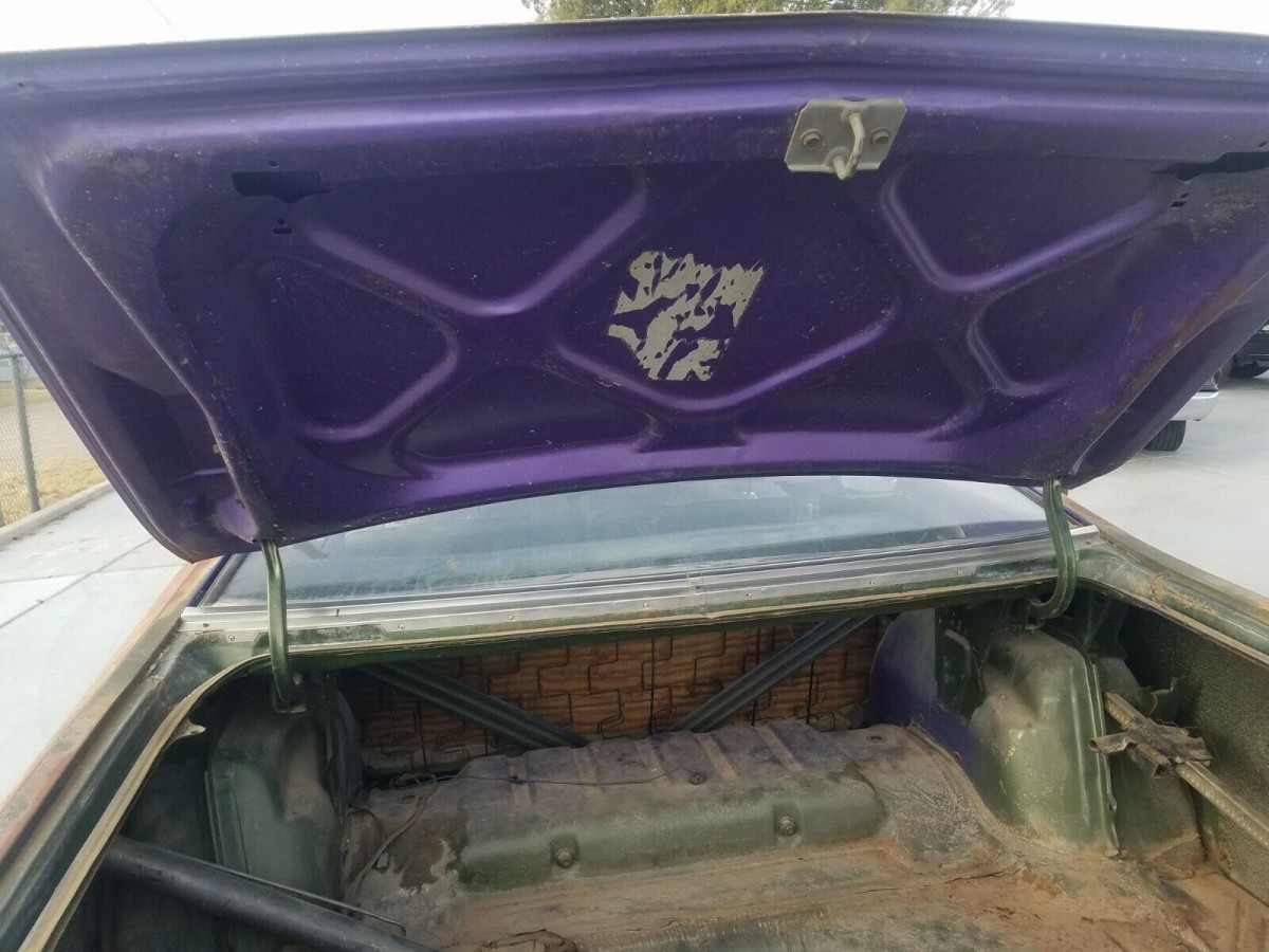The transformed car has not weathered well in subsequent years. Some of the merged sheet metal is crinkled here and there and the rear quarter panels are sporting some rust. We’re told the trunk floor has some small holes in it as well as another small hole in the driver’s rear footwell. Inside the car, new door panels are coming with the car to replace the ones that are/aren’t there, and the front seat is going to need recovering along with new carpeting. The dash pad looks surprisingly good although there is a hole in the dash where the radio once was (it’s coming along, too).