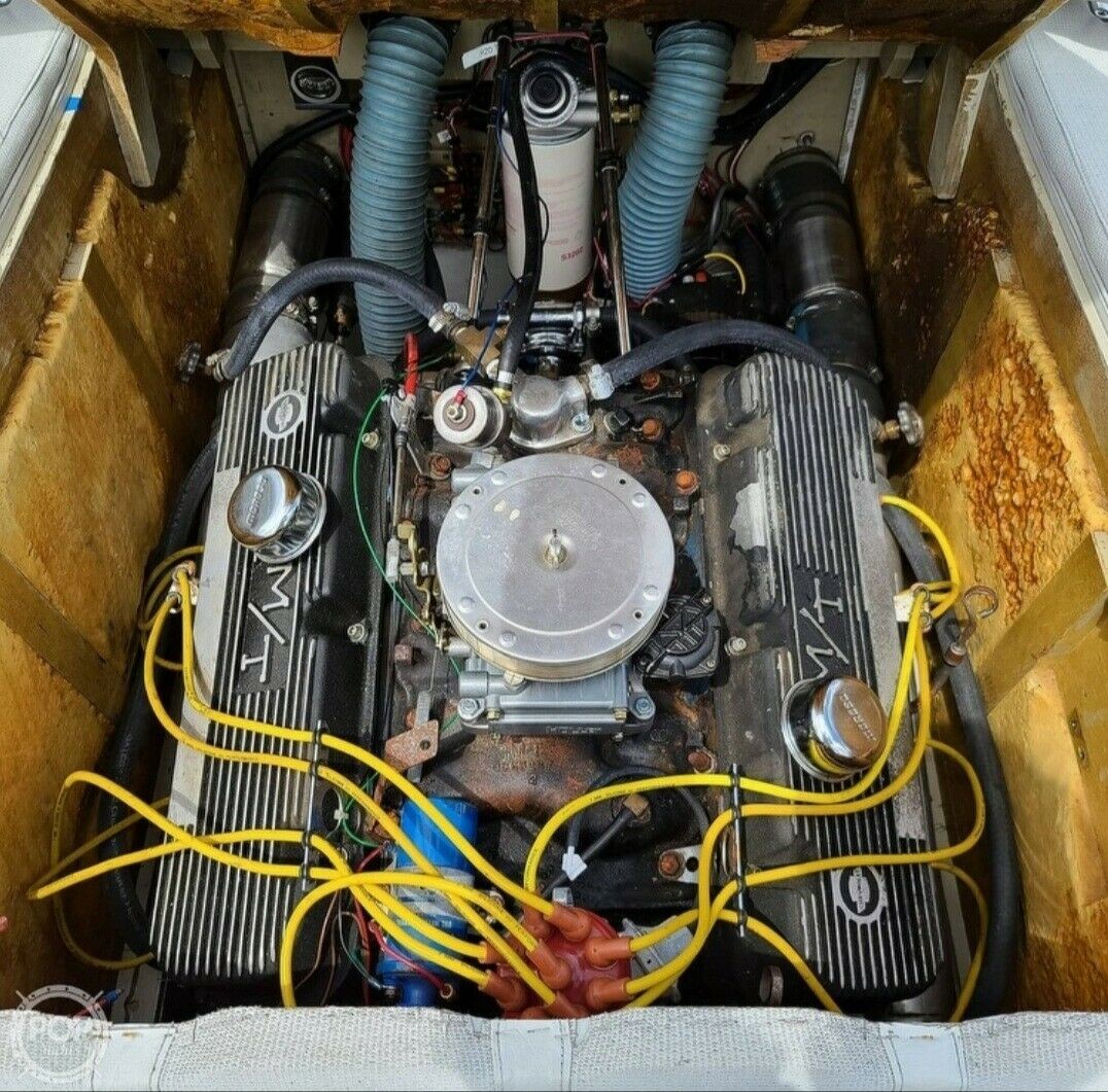 Well from what i see its not that big of a deal . As a matter a fact as it being a custom boat as stated is to be seen cause it looks to me to be a stock motor nothing big to brag about and with it having a vacuum secondary 4 barrel carb on it is definitly not the way to go with a boat motor that is for a the streets ,cause in a boat you rely on all the fuel you can push into the motor for rpms and power so thats one thing i see , and then as far as custom well you can say custom re hubilitated cause it looks like its a boat that had its deck redone and maybe for multiple reasons . For the buyer id really look this one over in my opinion . the hull and the top deck just doesnt go together to me .