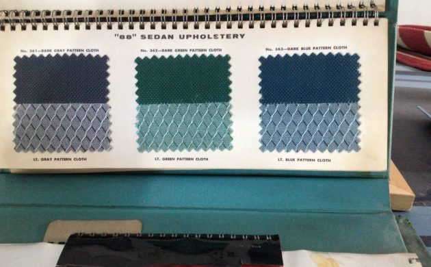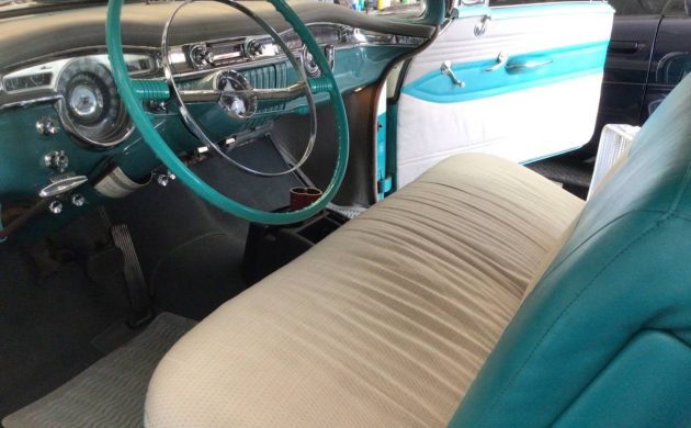 Like practically all car interiors of 1955, this 88 has a colorful cabin displaying a tasteful blend of turquoise and white (with shiny chrome and stainless trim). The seller says that the only negative are the fabric “wrinkles” on the front seat. I also spotted some on the door panels. This 88 has the factory clock and radio and there’s a photo of a modern AM/FM/CD player unit that’s mounted in the glove box. The seller is also including a cool salesman’s binder for the ’55 Olds that would let customers flip through to pick their car’s options, colors, interior, etc. You don’t see many of these since they were for dealership use only and were rarely saved.