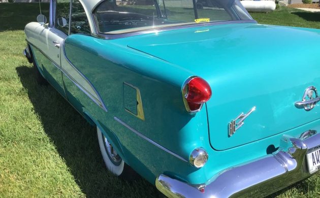 The color revolution was really rolling in 1955 and Oldsmobile was no exception. Customers could select from 19 attractive paint colors, and given the styling of the ’55’s, most were ordered in two-tone color combinations. Looking at the photos, the Polar White and Turquoise paint is shiny and very presentable and the chrome bumpers, oval grille, and all of the cool 88 rocket-themed trim looks great. I’ve always liked Oldsmobile’s “knife-blade” side trim as well as their fender skirts that accentuated the flowing shape of that distinctive side trim. And those super-cool “spinner” wheel covers helped to give these hardtop coupes a bit of a sporty look.