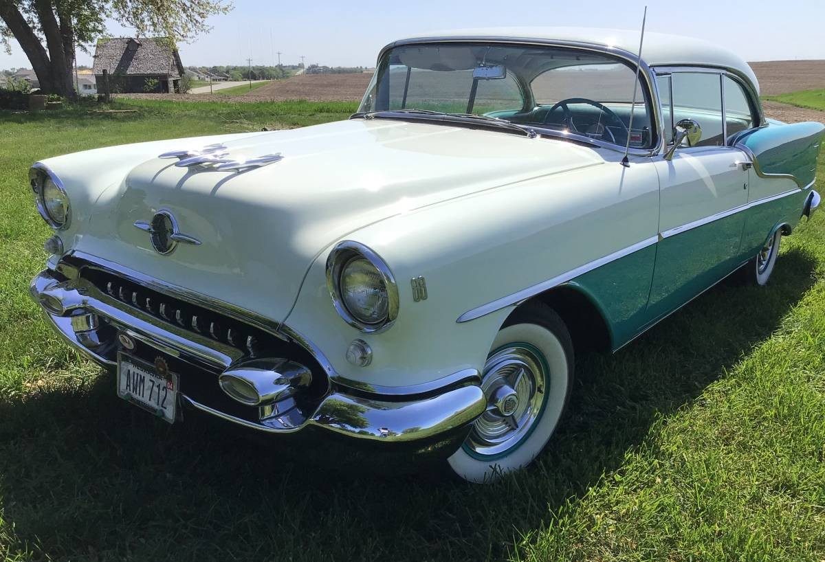 If one were looking for an automobile to represent the record-setting sales year of 1955, then this Olds 88 Holiday Coupe checks all the boxes. A classic 50’s two-tone color combination (turquoise and white), tasteful styling – especially being a sporty hardtop coupe, just enough chrome trim, a colorful turquoise and white interior, cool wheel covers, and a respectable V8 engine under the hood. The ’55 Olds also checked a lot of boxes for car buyers seventy years ago as a record number – 583,179 units – were sold and earned the division fifth place overall in sales. The 88 Series was the entry level Olds in ’55 and of the 222,361 Series 88’s built, the most popular model was one like we’re featuring here. Nearly 86,000 of these desirable 2-door hardtop Holiday Coupes found new driveways or garages and it’s easy to see why. They were just great looking, comfortable, and peppy cars.