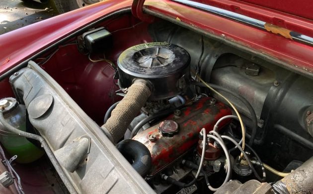 Looking past the vintage French charm of the interior, we see stains on the passenger-side floor mat, which could mean a leaking top or seals. The seller notes that the horn and tachometer need to be repaired. We aren’t shown the seats, but the car has individual seating in front, and a bench seat in the rear. Two tops came with each car – a color-keyed hard top and a soft top. This one’s hard top has been painted black; no soft top is in evidence.