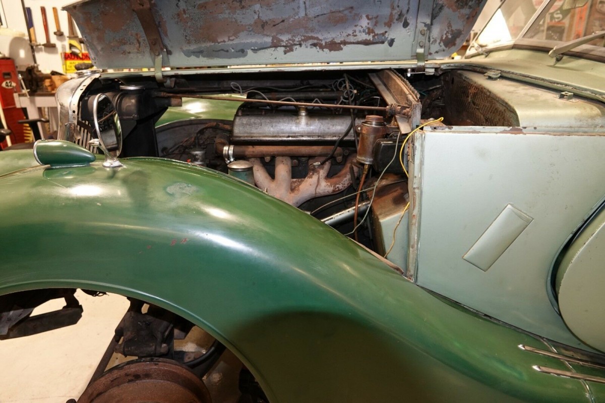The body of the Riley is in pretty reasonable condition. There are a few minor dings and dents, but they really should be quite easy to repair. The external chrome and trim appear to be complete, and it all looks to be in good condition. The car is going to need a repaint, but that probably goes without saying. I have seen several of these with various paint color combinations, but the two-tone green exterior is probably the nicest. The canvas top has obviously deteriorated, and there is a replacement top that comes with the car which will need to be installed.