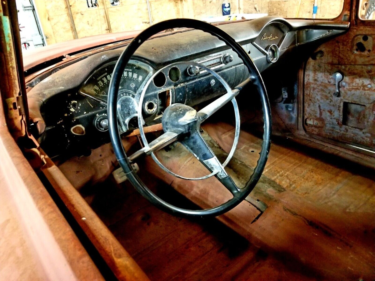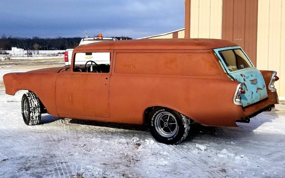 The Chevrolet Bel Air is an iconic vehicle. The Bel Air line was born in 1950 and named after an exclusive area of Los Angeles nestled in the Santa Monica Mountains. The car was known for its pillarless roof design, giving the “hardtop” a youthful flair. Several trim levels and body styles were offered; one of the rarer body styles was the sedan delivery, with production over three years from 1955 through 1957 of less than 30,000 copies. Most of these vans were sold to fleet operators. Here on eBay is a 1956 Chevrolet Bel Air Sedan Delivery, bid to $4,895, reserve met. This vehicle is located in Geneva, Wisconsin. The seller indicates that he has too many projects and not enough time, so something has to go. This photo shows that much of the difficult metal work has already been done. The floors, rockers, and frame are all said to be solid.