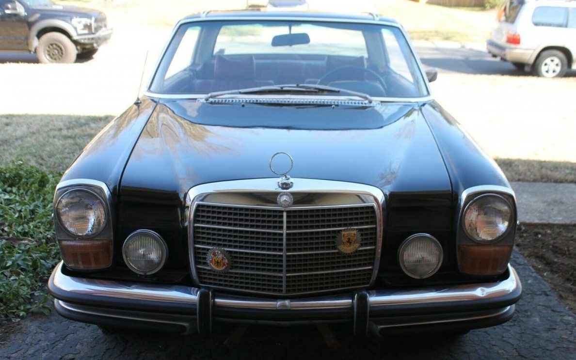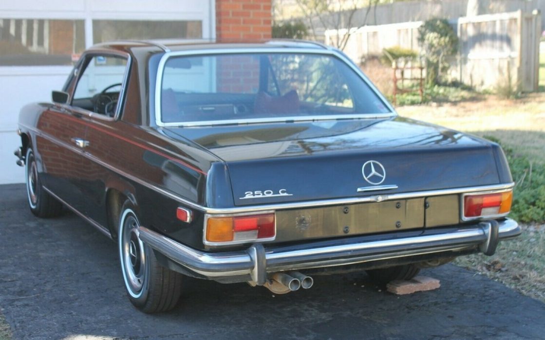 Parked in the aforementioned hay barn for fourteen years, this 250C has cleaned up pretty well. The seller claims that the finish is a repaint in the original lacquer shade and then adds, “A spectacular color combination and a rare Sunroof W114. Very little rust on the undercarriage… there is some rust in the inside rear quarters behind the rear wheels, as well as the lower rear driver’s door threshold…” OK, truth in advertising but all of that said, the body still presents itself as being sound. Additionally, the chrome, body trim, and prominent M-B grille show no signs of distress.