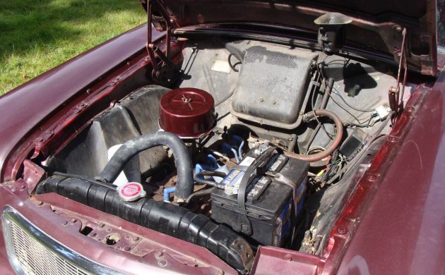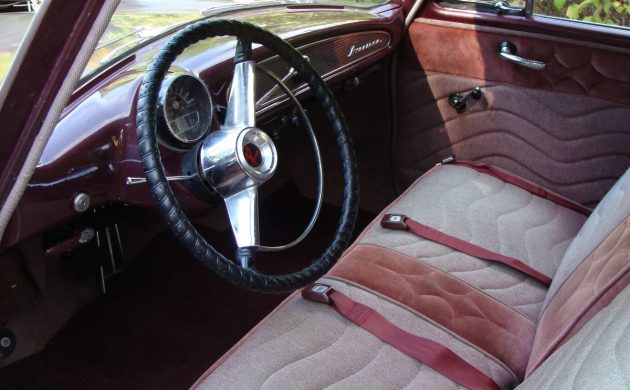 The 195.6 cu. in. flathead six-cylinder known as the “Flying Scot” generates 90 hp. Zero to sixty comes up in about 17 seconds, and top speed registers at 88 mph. The factory offered three transmissions – with the optional automatic touted as the only one available in a small car. The American competed directly with Studebaker’s Lark, slightly bettering its performance thanks to a higher torque rating. This example could use a few weekends’ worth of underhood polishing.