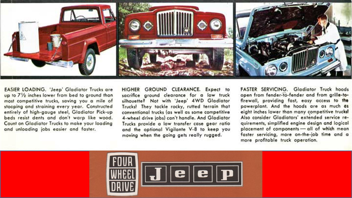 As you can see from this snippet from a 1965 Jeep brochure, they were quite proud of their Gladiator pickups (that’s what they called the entire line). And 1965 was the first year that the optional Vigilante V8 was available — but this truck doesn’t have it. More about that later!