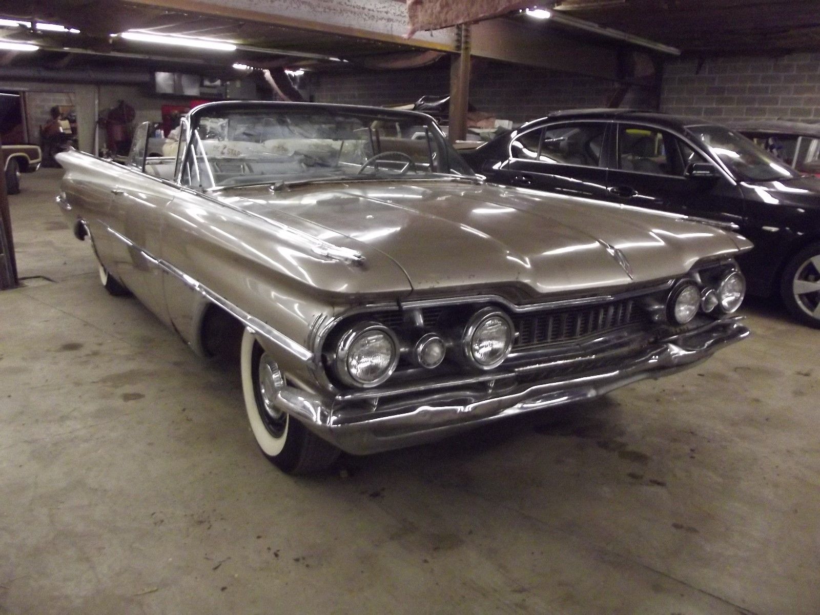My dad had a white ’59 98 droptop with black top, maroon leather upholstery….beeeyooootiful….rear 1/4 panels were a block long….would love to have this……completed….not enough time left to restore this one