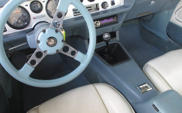 This Trans Am has a light blue deluxe interior which includes upgraded seats and door panels. The condition of the interior looks mint. Even the white seats that tend to get dirty or turn yellow over time look immaculate. The car is heavily optioned with T-Tops, power windows, air conditioning, rear defrost and power locks. While the car claims to be a Pontiac 400, that is apparently not its original engine. The shop receipts posted in the ad show a W Code in the VIN which indicates the car left the factory with the L37 301 cubic inch V8 engine. The Pontiac 400 had a Z code in the VIN.