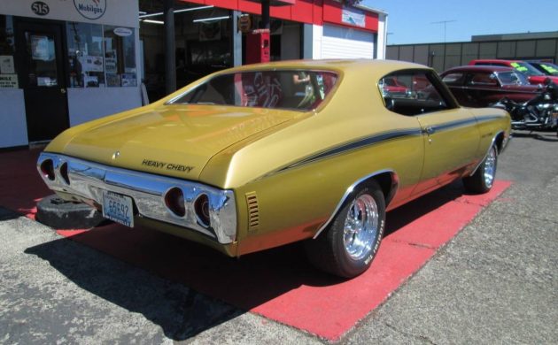 We’re told the gold paint was refreshed (when?) and the car will also come with the bling-free Rally wheels of 1972. Because of the lower production numbers, Heavy Chevies are harder to find today. Which may explain why the seller’s car’s asking price is close to what Super Sports went for not that long ago.