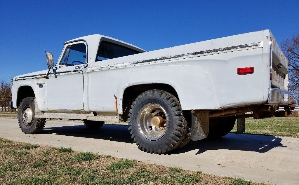 This looks like a 3/4 ton converted into a 1 ton by changing out the rear axle assemble. It’s quit common to see this conversion with the front wheels left as original and the back changed up to the 1 ton wheel. Down side is you now need to carry 2 different spare tires. Personally I would have put in a Cumins diesel and over drive automatic, this 440 would be a giant gas hog. Especially without the overdrive trans. Needs lots of work I certainly would not pay the asking price $14k. More like $4k. I’d keep the add on fenders they look ok. Finally I’d see if I fit up some bud wheels on the front.