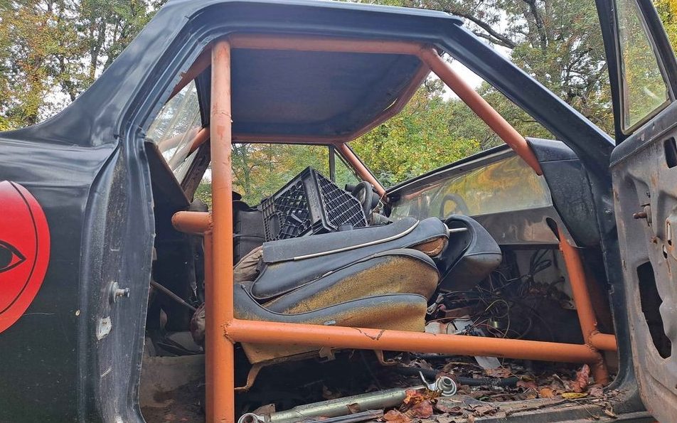 Not much to talk about inside. A full roll cage has been installed and a whole lot of detritus is piled up on what appear to be strato-bucket seats. It would be interesting to see how the dash and instrument panel has been “affected” along with the necessary minimal wiring. From what can be spied, the dash and instrument panel appear to now be just a piece of formed aluminum sheet metal.