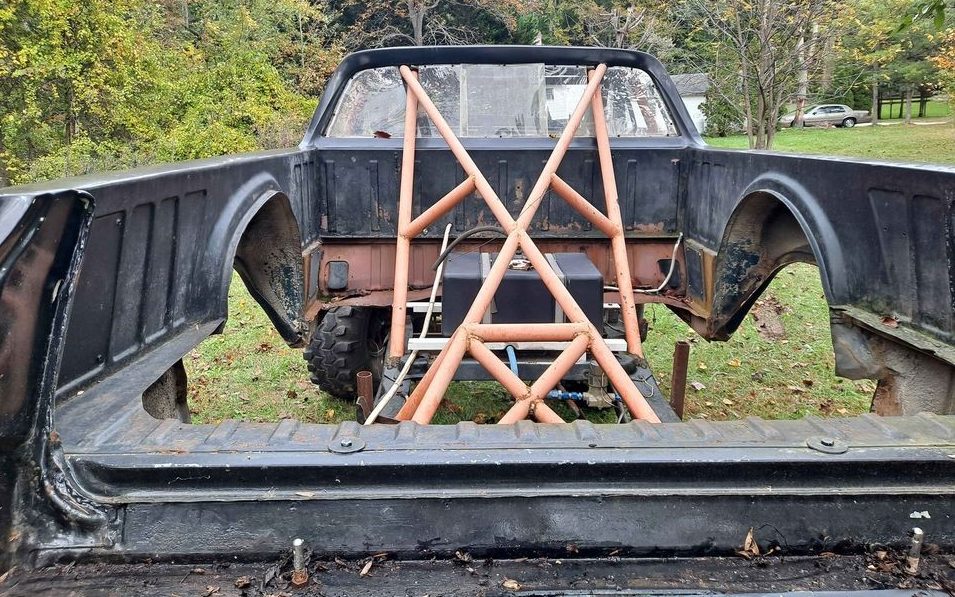 Examining its bones, the Hellcamino is sitting on top of a ’77 Blazer chassis that has been lengthened. The seller states, “Truck suspension is mocked up 4 link not finished“. I’m not exactly sure what that means but the front suspension is secured with some seriously arched leaf springs. I can’t tell with certainty what’s going on under the rear though it looks like a primitive trailing arm setup. There’s no mention made of the source of the axles but it’s logical to assume they came from the chassis donating Blazer, or some other GM vehicle.