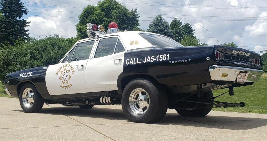 Looking like the physical manifestation of a high school motorhead’s study hall scribbling, this completely outrageous Dodge promises endless hours of entertainment for its owner and everyone who sees it. The mock police car, a 1968 Dodge Coronet from Macedonia, Ohio, comes to market here on eBay where it can be yours for the Buy It Now price of $55,000, or perhaps with an acceptable bid using the Make Offer button. If that sounds excessive, consider that the engine bay holds the powerplant from a 2018 Dodge Charger Hellcat and makes “in the neighborhood” of 800 HP. That’s good for a high 10-second quarter mile ET! Built for the 2019 Hot Rod Power Tour, this Hot Wheels car come to life is no fancy theme trailer queen, but a real driver that gets 22 MPG on the highway thanks to an overdrive transmission.