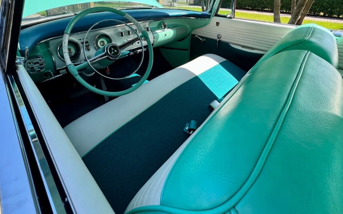 Nothing disappoints inside either, with the interior presenting about as well as the exterior. Buyers got the love-it-or-hate-it push-button transmission selector in ’56 whether they wanted it or not, but a rather innovative option offered the same year that this particular car is not equipped with was Chrysler’s “Highway Hi-Fi”, an actual phonograph spinning a record under the dash that operated through the radio. Here’s a video of a 1956 Chrysler New Yorker St. Regis demonstrating how it works. I’m not finding much to fault with this one, and I really like the green body and white top combo. What are your thoughts?