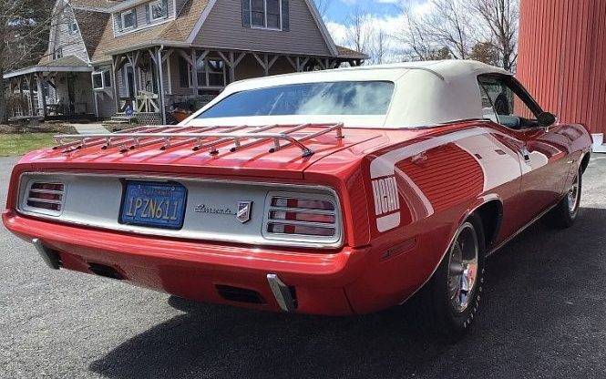 The listing for this Plymouth is extensive, there many fine images, about 100 actually, with lots of specific detail. It wasn’t until I got deep in the listing and performed a VIN check that I realized that this Barracuda did not commence life as a Hemi equipped car or even as ‘Cuda for that matter. And it would have had to have been a ‘Cuda to have owned a Hemi engine. It was originally a 318 CI, V8 powered Barracuda convertible that underwent a presto-chango conversion. And the conversion has been excellently administered. So, this Plymouth convertible is really a “sort of” tribute car, or a clone, or even a fake (though that sounds a bit chippy) because it is not an original Hemi convertible but it is, now anyway, a Hemi Barracuda convertible – a model Plymouth never built. The collector, who commissioned the conversion, tracked down a date correct 426 CI, 425 HP Hemi V8 engine, and had it rebuilt by a renowned engine builder (Lee Brothers Specialties). The listing spec sheet for the engine indicates a maximum dyno HP of 458. Interestingly enough, this Barracuda was built with a four-speed manual transmission. Noted Mopar guru and statistician Galen Glovier has certified that this car is one of only 17 Barracuda Gran Coupe convertibles produced in 1970, so equipped.