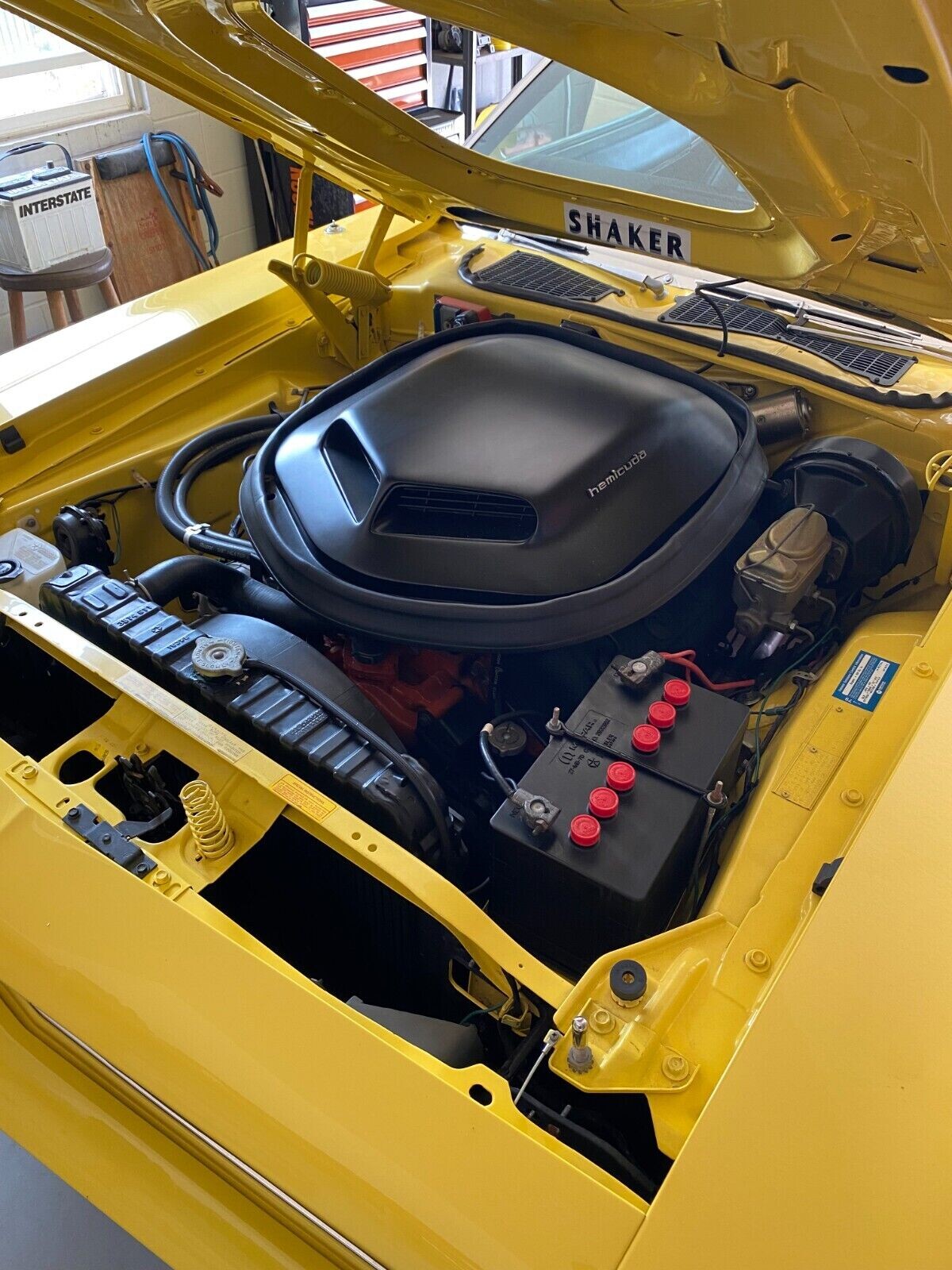 The seller describes this ‘Cuda as having undergone a rotisserie nut-and-bolt restoration, but I would consider it a refurbishment or custom build. There are several reasons I believe this, including the color change performed during the build process. The Fender Tag confirms it rolled off the line wearing Bahama Yellow, and pre-restoration photos support this. However, the restorer applied the more vibrant Top Banana to provide a stunning visual statement. It also wears “Billboard” stripes, although, as we will see, these aren’t correct for this car. The seller describes the ‘Cuda’s overall condition as perfect, and it is hard to argue with that assessment. The panels and paint look flawless, as does the Black power top. Climbing under the car reveals floors finished in the same stunning shade of yellow, with no evidence of rust, corrosion, or fluid leaks. The tinted glass is spotless, as are the factory Rallye wheels.