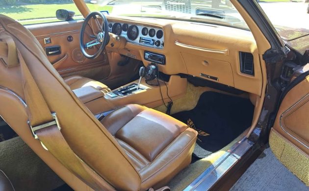 The interior looks clean and even the seat belts looks nice. The deluxe interior came with upgraded seats and door panels. The 62N1 camel tan vinyl interior shows well and I don’t see any cracks in the dash or sun damage elsewhere. The ad could use a few more pics as well as pics of the undercarriage. This Trans Am is riding on factory 15×8 aluminum wheels which came with the WS6 Special Performance Handling Package. A total of 117,108 Trans Ams were produced in 1979 with the Oldsmobile 403 cubic inch V8 power train accounting for 94.773 of total production.