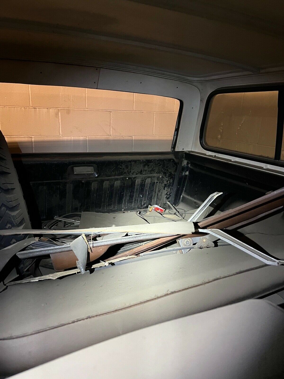 The dust is incredible. It’s thick, and coats every surface. The rear window looks to have been left in the down position, which makes you wonder if the previous owner intended to return to the Bronco far sooner than this. The new belt sitting on the hood also suggests plans were being made to show this truck some love before life got in the way. It seems likely that the building was sold or the Bronco was left in storage with bills unpaid; regardless, it’s safe to say the last caretaker isn’t coming back. I can’t quite tell what’s sitting in the back of the Bronco, whether they are interior parts or just junk tossed in through the open window.