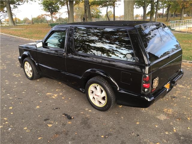 The original roof rack is missing, it’s got door handle escutcheons from a 92 Typhoon, center caps from a 91 Syclone (or someone painted the GMC red), the OE mirrors were replaced, along with the steering wheel as previously mentioned. The billet grill doesn’t bother me, but the plastic surround was never even painted (probably aftermarket junk) and those ricer taillights need to go as well.