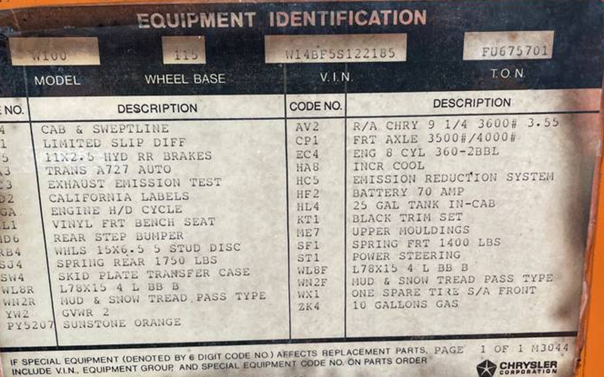 But, the good thing is that there are three interior photos and it looks pretty good inside, overall. And in all fairness, in that one exterior photo, this truck does appear to be in good condition, body-wise, at least on the passenger side. The W100 is Dodge’s 1/2-ton 4×4 and their D-series was a 2WD pickup. The seller mentions that other than a few scratches and dings and dents, it’s all original outside. Hagerty is at $7,800 for a #4 fair condition truck so there’s three-grand to work with as far as getting an engine in this thing. They’re at $17,900 for a good condition truck so this could be a very nice project.