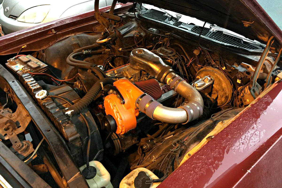 Packing a small block Chevrolet 350 V8 and a centrifugal supercharger, it is clear that this wagon has some “scoot” to offer, and is likely a fun ride. There isn’t a whole lot of information provided on this wagon, but the pictures say enough to get you asking the “right” questions. Tubular control arms, and a serviceable pan hard rod have been added to improve the fun level of this family hauler. For an Alaskan car, there is little oxidation or rust under the hood showing that this wagon gets special treatment for the change of seasons.