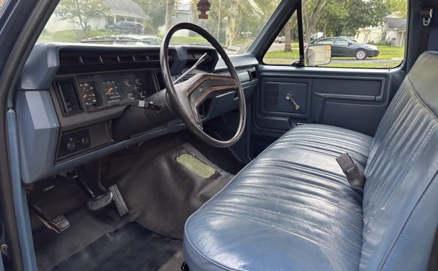 You can see the hole where the shifter used to reside. As the seller tells it, this F-250 was parked for a while by the same owner, and then put back into use, before an unexpected break-down caused it to be parked for an extended period of time. Once this happened, the older owner didn’t go back to the Ford, and it ended up in the seller’s hands. He discovered all three fuel pumps were dead, and there was old gas in the tank, leading to the no-start condition. In terms of the transmission retrofit, he notes that the work was done to a decent standard, and that “….is a plug and play factory transmission controller under the dash and it shifts great.” The interior is in tidy condition as well.