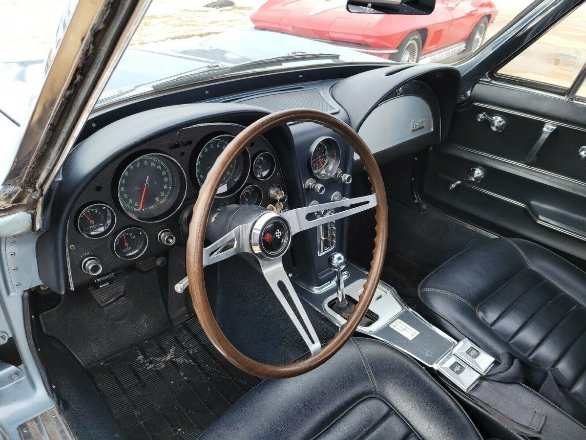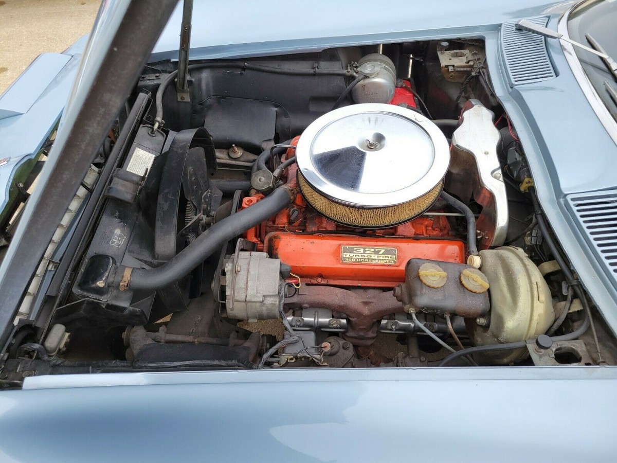 Opening the doors reveals an interior that adds to the appeal of this Corvette. The original owner ordered it upholstered in Code 418 Blue vinyl, and it seems that it remains original and unrestored. There is some slight stretching on the seat bases, but the overall condition is close to perfect. There is no evidence of wear or physical damage. The dash appears excellent, as does the console. Refreshingly, there is little in the way of fading on the carpet, nor is there wear on the beautiful wood-rimmed wheel. It isn’t loaded with optional extras, but the factory AM/FM radio remains intact.