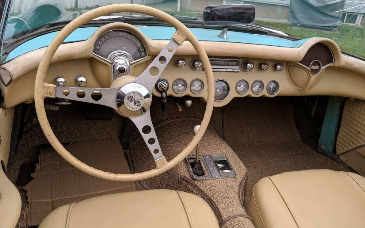 The seller lists some of the options that grace this Corvette and it’s a pretty extensive list. Of the 3,467 units produced in ’56, we find the following option count that matches this example: Dual Quad 225 HP Engine: 3,070; Powerglide Automatic Transmission: not recorded; Power Windows: 547; Power Folding Top: 2,682; Auxillary Hardtop: 2,076; AM Radio:2,717; Windshield Washers: 2,815; Parking Brake Warning Light: 2,685. The engine count is the surprising one. I researched two different sites, corvsport.com and c1registry.com, and both listed the 3,070 figure as the correct number for RPO469 which is the dual-quad equipped version. The seller is not positive that the dual-quad motor graced this ‘Vette originally but believes it to be the case due to the fuel line location and the three-bolt exhaust manifolds. Unfortunately, this example has been converted to a single carburetor in the form of what appears to be a Holley 600 CFM. The seller states, “The car runs and drives but is NOT roadworthy tires need to be replaced brake lights don’t work but come on when you pull the headlight switch, headlights don’t work and turning signals don’t work front is missing the harness…” Makes one wonder what happens when you try the power window switch… So some wiring/rewiring needs to be facilitated. There’s no reference as to how the Powerglide automatic transmission operates.