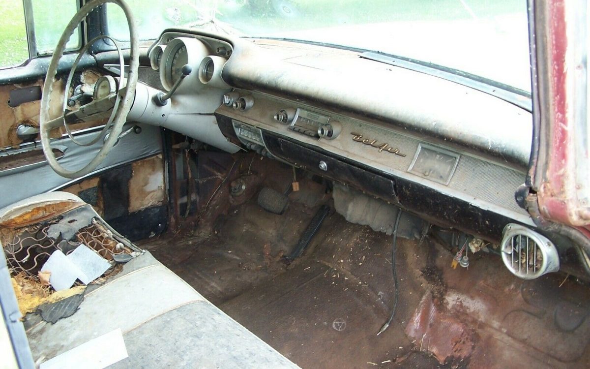 The seller sings this ’57s rust-free praises and it does appear to be pretty much so. The underside has a bit of scale and heavy surface rust but it looks to be solid. Also indicated is the original Dusk Pearl finish, it could be original, it’s appropriately age-worn. The body panels are all in a pretty good state except for the passenger side fender which has had a run-in with something stationary, it’s bent but possibly salvageable. Most of the trim is in place but it’s not in great shape as it’s flattened or twisted, and in some cases, held on with sheet metal screws. The seller adds that some of the glass, including the windshield, will need to be replaced. He concludes that this may be a 55K mile example – that seems like a stretch.