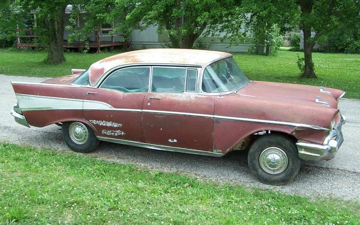 I haven’t looked at a tri-five Chevy in a long time. After all of these years, there’s not a whole lot that you can add to what is one of the most popular and well-documented series of cars of all time. This review will a bit different, however, as it is covering a ’57 Chevrolet Bel Air, four-door hardtop, a model not given to the collectible throws of its two-door hardtop sibling. It’s also not a body style found too frequently. Located in Everest, Kansas is this ’57 Chevrolet four-door, “Sports Sedan”, and it’s available here on eBay for a current bid of $4,500, seventeen bids tendered so far.