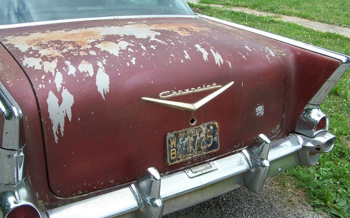 The Dusk Pearl Metallic paint you reference is what is under the “blurple” that was put over it. That’s the color under the flaking paint on the trunk lid. Original color is a light pink. Must be a bunch of these in Kansas as in the early ’80s a customer asked us to find a ’57 for them and restore it. In OKC at the time so went north to Kansas to find one. They were all over the state, a lot with factory air, and we tripped over a one owner 4 door sedan that literally needed nothing more than paint and fluid changes. It had the dealer installed AC and a tube type garage door opener in it. Took off most of the trim to paint it properly. That was the biggest challenge as it took forever to put it back on. Counted 11 different types of clips holding everything together. We got a good deal on the car as the 92 year old lady who owned the car said “it was getting too wide for her garage door”.