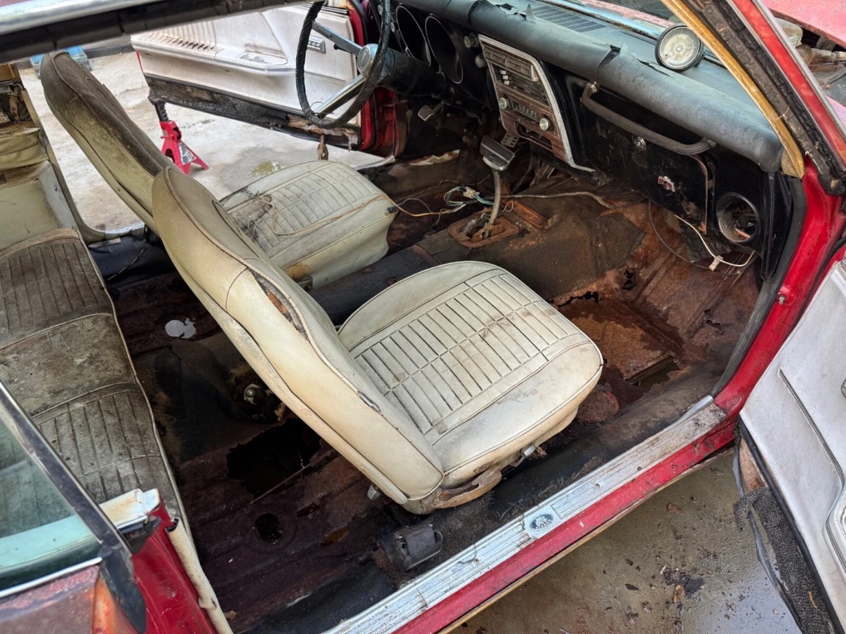 I briefly had a nearly identically equipped (but much better condition) 67 400 car several years ago. I rescued it from the tarp jail it was stored in in the owner’s driveway. Original paint White car, red guts, and exact same option list as this car except no tach/gauges, and it was … a floor shifted 3-speed manual !!