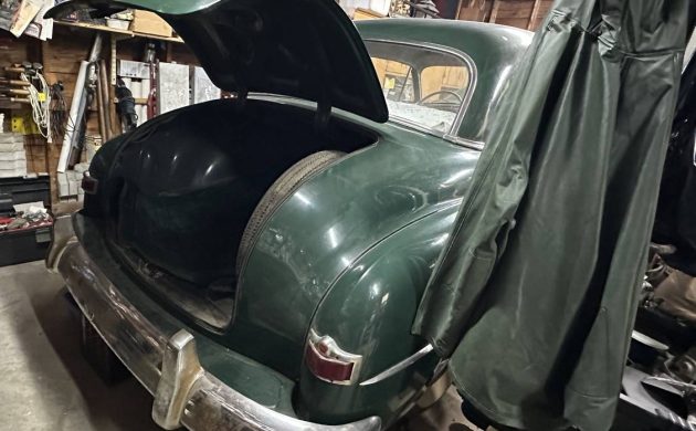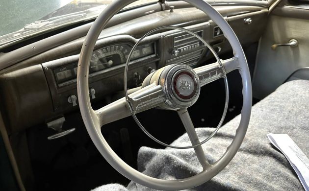 A guy named Jeff is selling it for the current owner and the Plymouth has a clean Massachusetts title in the owner’s name. It’s listed as a “barn find,” but no details are given. The current owner purchased it in 1997 with hopes of restoring it, but “life and recent health issues” are now forcing the owner to sell. It’s in a cluttered garage bay, so there are no side views of it and the rest of the photos are in the “details and closeup” category. The car’s factory Sherwood Green paint looks presentable to be 75 years old, the body looks solid, and I’m not seeing any rust issues. It’s hard to judge the condition of the chrome because of the dust and dirt but it looks okay. The trunk compartment is very clean and includes a trunk mat and the Plymouth’s original spare tire, and the undercarriage looks good as well.