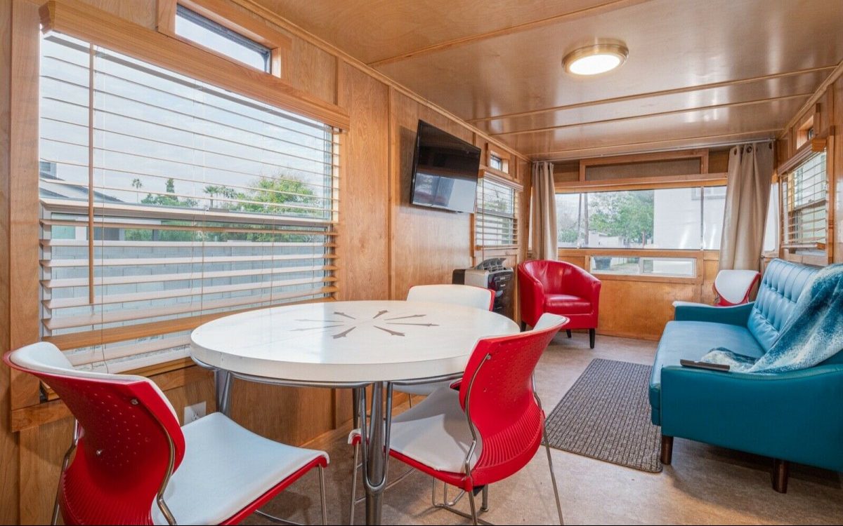 Here you can see the living room/dining room area. Unlike Airstream trailers that have a similar look, the Spartans feature taller sidewalls that allow for a more roomy interior. The retro furniture is perfect for the theme and the ad says the windows cost about $10K! They let in a ton of light and I’m sure they make the interior feel that much roomier.