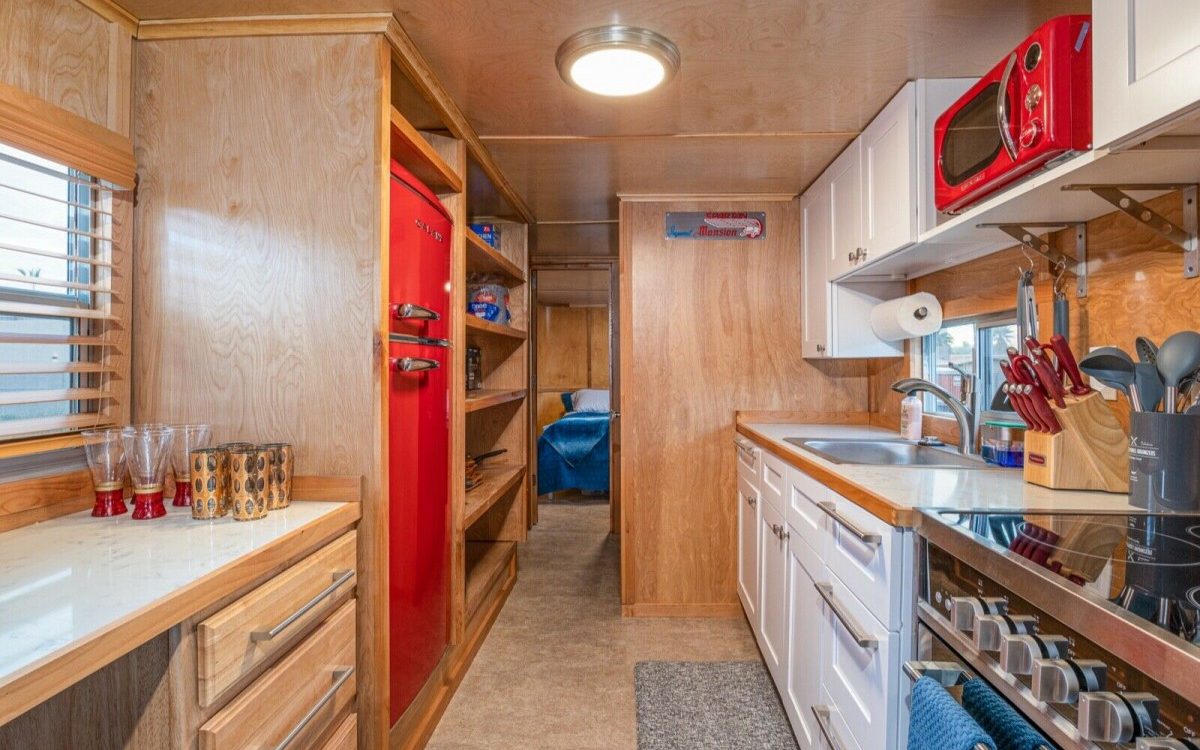 Moving toward the middle of the trailer, you can see the kitchen area which has been completely restored. The electrical and plumbing systems are new. The kitchen features a built-in home office, soft close cabinets, and new “retro” appliances. Between the kitchen and the bedroom lies, the bathroom. It has been fully refurbished with synthetic slab-marble.