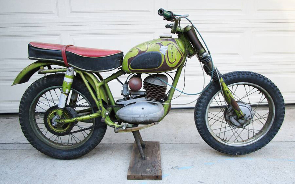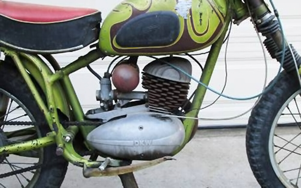 Dampf-Kraft-Wagen (DKW) was founded in 1916 and tried to make a name for itself by making steam engines. When that didn’t work, they made a small engine, Des Knaben Wunsch (the boy’s desire), and a modified version made its way onto a bicycle, and the rest is history. In the 1930s, they were the biggest manufacturer of motorcycles in the world. This example has Triumph front forks, according to the seller, and it was found in a garage in its current non-running condition.