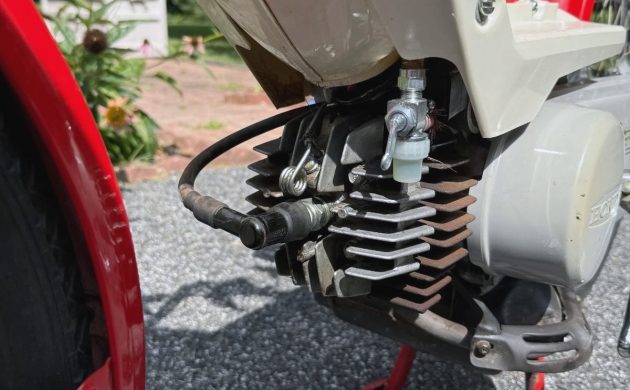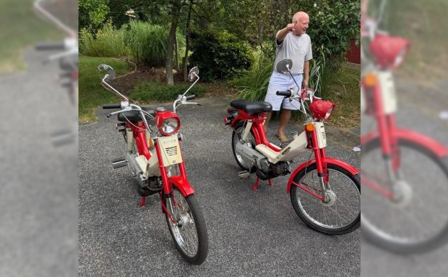 The engine is Honda’s 49-cc two-stroke single, and it gently passes through a Honda V-Matic variable-ratio transmission with automatic clutch to the rear wheel, for a top speed somewhere under 20 mph. These are not fast motorcycles. I could race one with my Motocompo and maybe come out on top. Well, not in the looks-cool department, but in speed. The seller says they both work as they should, and if they were the PA50-II models with a 30 mph top speed, this price would be a steal, as they can sell for almost that much each. Any thoughts on these little mopeds?