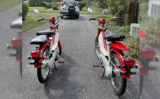 As close to being as perfect a campground get’r-around’er vehicle as there is, Honda’s light and easy-to-ride Hobbit mopeds came in two varieties and are easy to tell apart from their color: red = 20 mph, yellow = 30 mph, at least for the 1978 and 1979 models. This pair of 1978 Honda Hobbit PA50-I mopeds is listed here on eBay in Baltimore, Maryland, and the seller is asking $4,750 or best offer. Thanks to John L. for the tip!