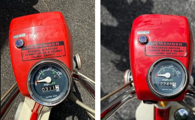 Now, for a little history about… er.. wait, zzzzzzzz… Sorry about that. It’s such an interesting time period, and the history of Honda starting its first-ever factory outside of Japan and how it evolved into making these little mopeds seemed worthy of a mention. You can see the low miles on these two Hobbits in the combined photo above. The miles are low, but they aren’t velvet turntable trailer queens; they do have nicks and scratches from being used for over four decades. The seller bought them earlier this year from the original owner, who bought them both new in 1981. The PA50 Hobbit was made for the U.S. from 1978 through 1983, but the PA50-1, the slower model as seen here, was discontinued after 1979. The PA50-II continued on here until 1983 and until 1991 in the UK and European markets.