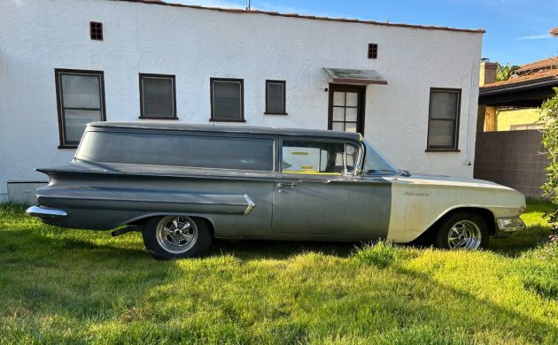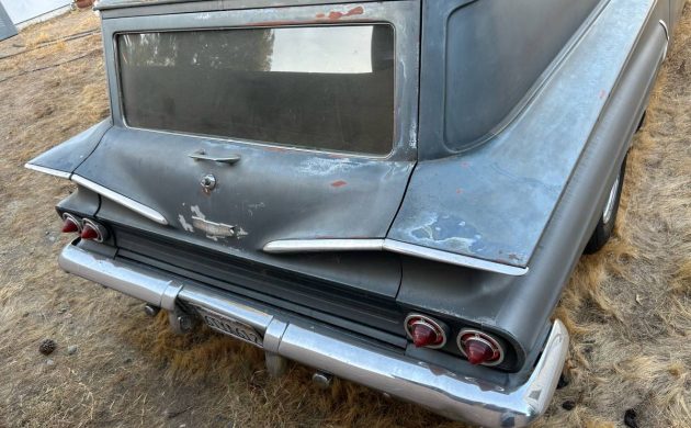 This is a unique find and has potential to be a nice driver if the frame and floors aren’t too far gone. I would be curious to see how it looks sitting on level pavement and not with the front wheels parked in a low spot. It has good bumpers, trim and the grille is straight, which is a plus with these. My dad had a 59 Impala 2 door, white with red interior, 283 engine. I have always loved these 2 years with the aircraft style fins that flow out back. I would lean towards a white paint job after you get it straight. The rear cargo area is a blank slate for whatever your imagination conjures up. The asking price, if all checks out, needs to be more around the $10 – 12K range.