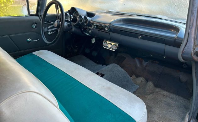 I refer to this Sedan Delivery as the last of the breed because 1960 was its swan song – there would be no more such configuration in Chevrolet’s lineup until the introduction of the notorious Vega and its “Panel Express” model in 1971 – same concept, just a very different vehicle. While I suggested that the 1950 Sedan Delivery reminded me of a hearse (some took exception to that comparison, but I still see it that way), this ’60 edition just looks like a Biscayne two-door station wagon with the rear side windows blocked out. The tailgate on this ’60 model, unlike the ’50 edition, which swings out from the side, has a standard fold–down flip-up arrangement, more similar to a station wagon. The body of this S.D. looks sound, with the front clip having been replaced, and thus the mismatched paint. The seller adds, “She led a very sheltered life and must have been stored indoors. She is very rust-free, except for the floor pans, which were covered by a vinyl flooring that trapped moisture underneath. The rest of the car is very solid.” Obviously, we’re rolling on a Cragar S/S-type wheel swap, but the exterior, all in all, looks rather original.