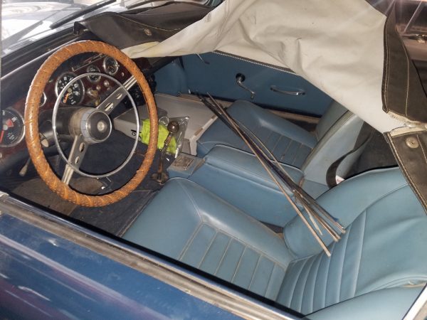 Inside, its like going back in time to the early seventies. I am no expert on Tigers, but I am suspicious that the upholstery may not be factory correct. I may be wrong about this, and I hope a reader can set the record straight. The steering wheel is ensnared in one of those old, wretched steering wheel covers that you would get at your neighborhood drug store. I haven’t seen one of thse in a while, and I really had hoped I never would again. All the instruments are there, and they look to be in fair condition. The shifter does worry me. I believe it to be correct for the car, as it has the T-handle for putting the transmission into reverse. What worries me is the surface rust. This makes me think the car may have been stored in a humid environment for some time. Not a deal breaker, but a sign that the car needs to be looked over carefully. Especially the floor.