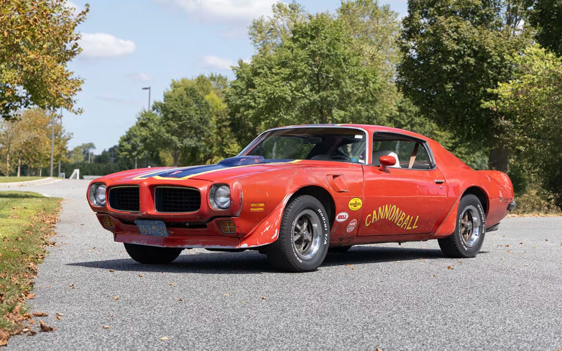Finished in red with a blue center stripe outlined in yellow, the car wears the same look it carried in the film, complete with its personalized “003MEN” California license plate, a nod to the Carradine brothers. Inside, it features a white interior with bucket seats and a center console, blending classic Pontiac muscle with a touch of 1970s flair.