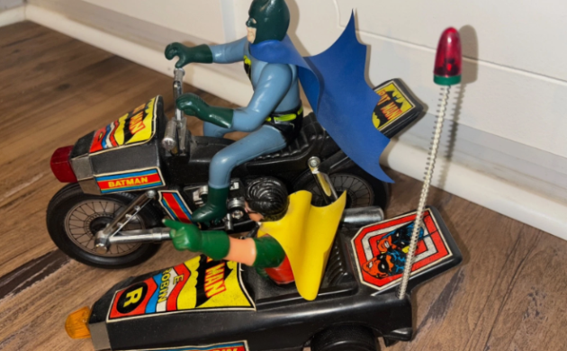 The TV show and movie used two versions of the custom Batcycle, one based on a Harley-Davidson and another on a Yamaha. While Adam West and Burt Ward looked like they were having a blast on it, they never actually drove the Batcycle, with those honors going to stunt doubles (who said it was a pain to operate). Over the years, several toy companies have released their versions of the Batcycle, and we don’t know which one this is. The seller doesn’t say, and none of the photos include the all-important original box, which we assume has flown the coop. We’re told this one is from the 1970s.
